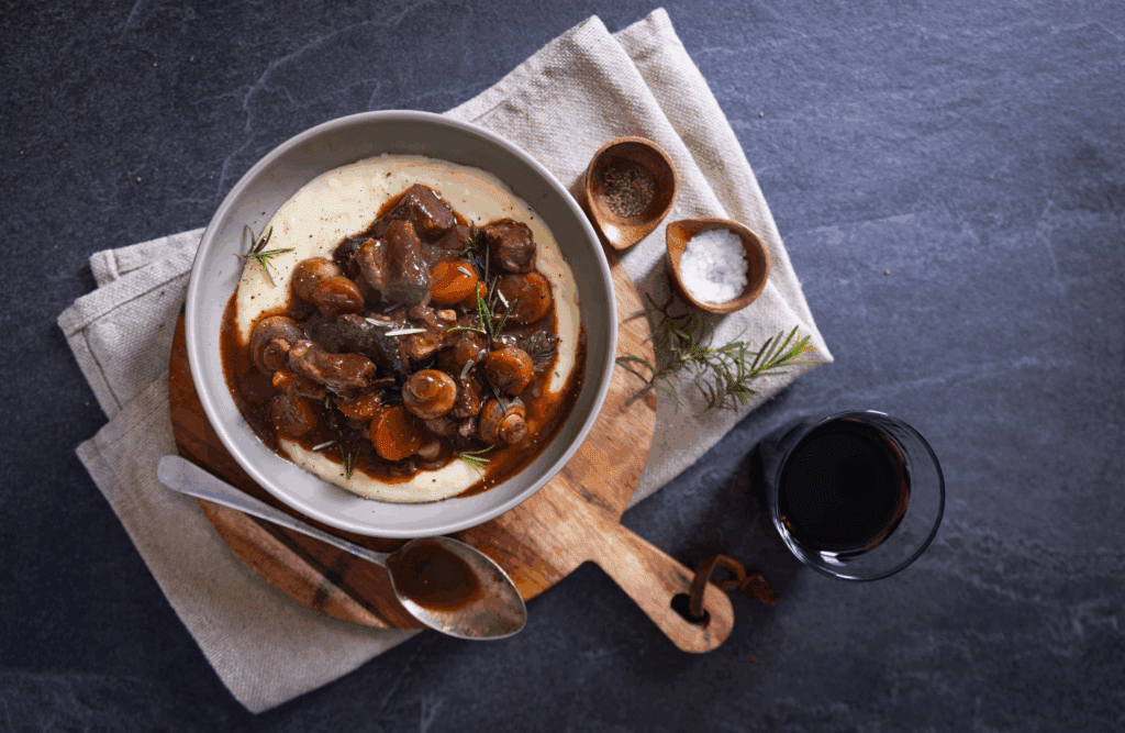 A hearty stew of fall apart cubes of pork neck slowly braised in a red wine sauce with bacon, carrots, onions, and mushrooms. Take your time cooking it, until the meat is tender and the sauce rich and flavourful.